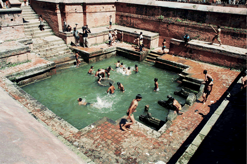 A les parts antigues de les ciutats newars, al Nepal, hi ha uns espais que canvien de fesonomia i de concepte diverses vegades al llarg de l’any. Es tracta d’uns indrets públics creats al voltant d’una font d’aigua que tenen diverses funcionalitats. A vegades són piscines per a la canalla, a vegades rentadors de roba i dutxes a l’aire lliure, tot sovint fonts d’aigua potable, i, només en determinades ocasions especials, es converteixen també en espais per a la festa.
