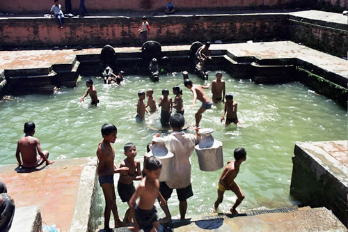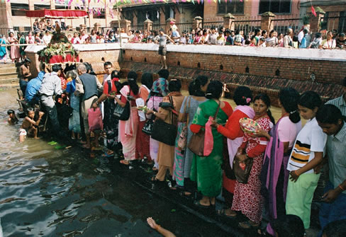 3. És un espai de festa. En alguns d’aquests espais, una setmana l’any s’hi celebra una festa. A Patan, per exemple, una vegada l’espai és ple d’aigua, i només en un moment molt determinat de l’any, la lluna plena d’agost setembre, s’hi celebra la festa del Janai Purnima. Al bell mig de l’aigua es posa una passarel·la de fusta que va de punta a punta i al mig s’hi instal·la una capella, al centre del qual hi ha un pal de fusta. Allà dins, durant la nit de la lluna plena s’hi instal·la una imatge daurada, amb la forma d’unes serps. La llegenda local explica que l’aigua de la bassa prové directament dels Himàlaies i que arriba per una cavitat secreta fins aquell lloc. La història i la festa, que vaig poder seguir l’any 2000 és absolutament fascinant.