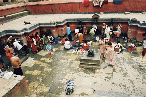 1. És una font, un sortidor d’aigua. Durant la major part de l’any, la gent accedeix a on hi ha les fonts d’aigua per proveïr-se d’aquest líquid. L’aigua serveix bàsicament per cuinar. Desconec si l’aigua és potable o no. En la major part dels seus usos, les fonts són utilitzades per rentar la roba i assecar-la. Les dones utilitzen l’espai com un rentador públic. (Al Nepal molt poca gent té aparell per rentar la roba, tot i que ja està arribant aquesta tecnologia). Alguns fins i tot, a primera hora al matí o al vespre, el fan servir per dutxar-se. Els sortidors són de pedra i s’aparten de la paret, fet que aprofiten els nens per jugar i balancejar-s’hi. Molta gent és al primer pis, mirant què passa a baix. O al segon, llegint o festejant amb la seva parella. Hi ha molta gent que hi fa la becaina, altres que hi passen la mona, molts que hi jauen sense fer res més que això, jaure i mirar, o per parlar amb amics.