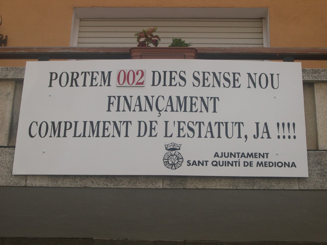 Perplexos? Jo diria que estic al·lucinant amb les mandonguilles que he menjat aquest migdia. Ens volen engatussar una vegada més, asfixiant-nos econòmicament i saltant-se la justícia a la torera, i ens ho prenem o bé com s’ho prenen ells “Ya estan otra vez estos catalanes dando el coñazo y pidiendo más. Hay cosas que son intocables” o bé de manera pseudoprogre patatera “Va, tot això de l’Estatut i el finançament és cosa dels polítics. A la gent del carrer, això no ens preocupa”. Alucinant… I la televisió del país, jugant a la puta i la ramoneta. (La foto és d’una pancarta col·locada a l’ajuntament de Sant Quintí de Mediona. Agost de 2008)