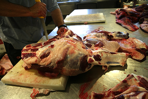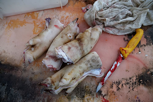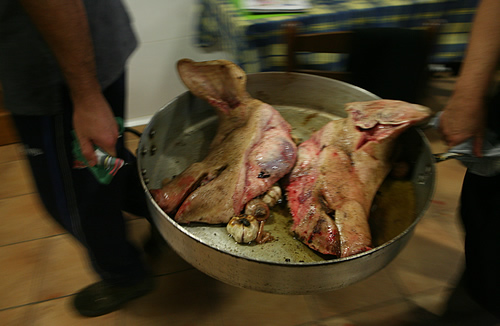 De la matança d’avui m’ha sobtat molt el baix preu que cobren els matadors, en comparació a la feinada que fan, la celeritat amb què executen el procés de convertir l’animal en un munt de carn. També he pogut parlar amb l’àvia de la casa, que m’ha corroborat que mai s’havia fet cap ritual de tipus religiós abans de matar l’animal. En aquest mas hi ha la sensació que no es para mai: amb algunes parts del porc que han matat avui ja preparaven el menjar d’aquesta nit per una colla de metges gironins especialitzats en SIDA que havien reservat taula fa dies.