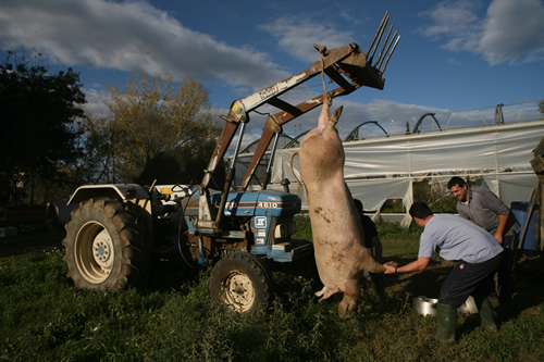 Acabat el dinar, i engolit el meravellós flam de ratafia que prepara en M, ha començat el procés de matar el porc. Avui en mataven un de la temporada passada, ben gros, de vora 150 quilos, han dit. Encara és una mica d’hora per fer la matança, encara no fa prou fred, però aquest havia quedat de l’any passat i al mas ja se’ls han acabat els embotits. El mètode per matar-lo és el següent: li lliguen les potes de darrera per controlar que no s’escapi, li fumen un cop de maça al cap que l’estaborneix, el pengen cap per avall i després el degollen. Darrera meu, la H s’ho mirava tapant-se les orelles mentre jo conversava, mentre feia les fotos,  amb l’E, en B i el seu germà, que m’anaven explicant anècdotes sobre la seva feina, amb una naturalitat espaterrant.
