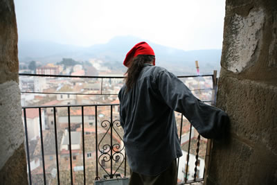 A en J, un petard gros li va fotre enlaire la mà dreta i, ara que som dalt del campanar llançant els 70 coets anunciadors de la festa, se n’en carda. Diu que plora per les nits. La seva mare em va explicar que quan li va passar l’accident la va anar a veure per consultar-li què havia de fer. Ara és l’encarregat dels dimonis de l’Encamisada i de la colla de diables de Falset. Com abans de l’accident. Amb el puru als llavis, no para quiet. Contagia l’esperit de la festa a tothom. No para de jugar amb els petits i fer broma amb els companys. Ens explica que a Falset la barretina es posa d’aquesta manera -assenyalant el front-, i tot seguit, se l’abaixa fins que li tapa els ulls i diu: “perquè si la duguéssim així no ens hi veuríem!”. M’explica que els coets, que han passat la normativa europea, els han dut uns japonesos amb un vaixell que han aparcat a Reus. Gat vell i escaldat amb la pirotècnia, vetlla per la seguretat dels nens que són dalt del campanar. Fot un fred que pela, la boira és bastant espessa ara al migdia, però a ell tant se li en fot. Quan s’adona que la campana del capdamunt no va i vol tocar els quarts, per anunciar que queda menys pel llançament, surt a la balconada i crida “tres quarts d’una”. El crit ressona per tot el poble.