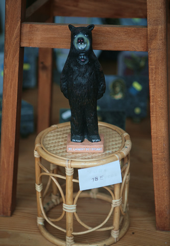 Primer vam passar -a través de la sinuosa carretera de Maçanet de Cabrenys- per Sant Llorenç de Cerdans on vaig tenir la oportunitat de fer-me amb una figura de ceràmica representativa del Ball de l’Ós. L’havia vist l’any passat quan vaig anar a documentar aquesta festa i em va encantar. La ven en J, el pintor del poble que, ara fa uns anys, va decidir impulsar la construcció d’una icona de la festa. Es va posar en contacte amb un dels tallers vinculats al Museu dels Sants d’Olot, la va dissenyar i en va encarregar unes quantes, que ara ven a la botiga de productes funeraris que hi ha davant el preciós -per l’horitzó de muntanyes nevades que el resguarda- cementiri del poble. Només n’hi queden unes poques, menys d’un centenar i diu que ja no en farà més…