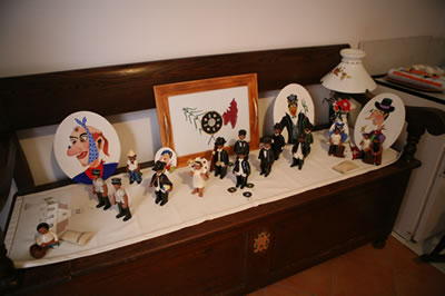 En primer lloc, m’ha sorprès la presència d’una espècie de pessebres santjoaners a moltes llars. Es tracta d’un espai de la casa, sovint a l’entrada, sobre una taula, on hi ha un conjunt de figures de mides i formes diverses que reprodueixen a escala diferents elements i personatges de la festa. El cas que vaig poder fotografiar era una reproducció de la comitiva del Dia d’Es Be: els policies, el flabiolaire, els caixers, s’homo d’es be, els que juguen a llançar-se avellanes… Sens dubte, aquest petit altar de la festa, present en moltíssimes cases i fet exclusivament per a l’ocasió (es desmunta quan acaben les celebracions) té moltes semblances amb els pessebres nadalencs. Les peces s’adquireixen totes de cop o una a una, en cada edició, de manera que el conjunt pot ser homogeni o bé heterodoxe, en funció de les peces. Sens dubte, una idea excel·lent, perfectament exportable a tantes festes, sobretot les basades en seguicis festius i de les que ja existeix cert “merchandising”, especialment pel que fa al bestiari festiu. Es tracta de reproduir, a escala i amb figuretes comprables (una cada any), el que passa als carrers els dies de la festa.