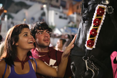 Un altra de les coses que em va sorprendre passa durant el dia 24 a la nit, abans dels jocs al Pla. La gent que és entre els cavalls busca el mirall que duen al front els animals, sobre els ulls, al bell mig d’una creu que fa de guarniment. S’agafen al morro de l’animal i li fan baixar fins a poder veure’s reflexats en el mirall. Ho fan persones individuals però també parelles. No sé si la cosa respon a la demanda d’un desig o és simplement és un joc -no ho vaig demanar-, però el que si que vaig poder apreciar és que quan s’aconsegueix l’emmirallament s’esclata d’alegria. És un detall, si es vol insignificant, però em té realment intrigat.