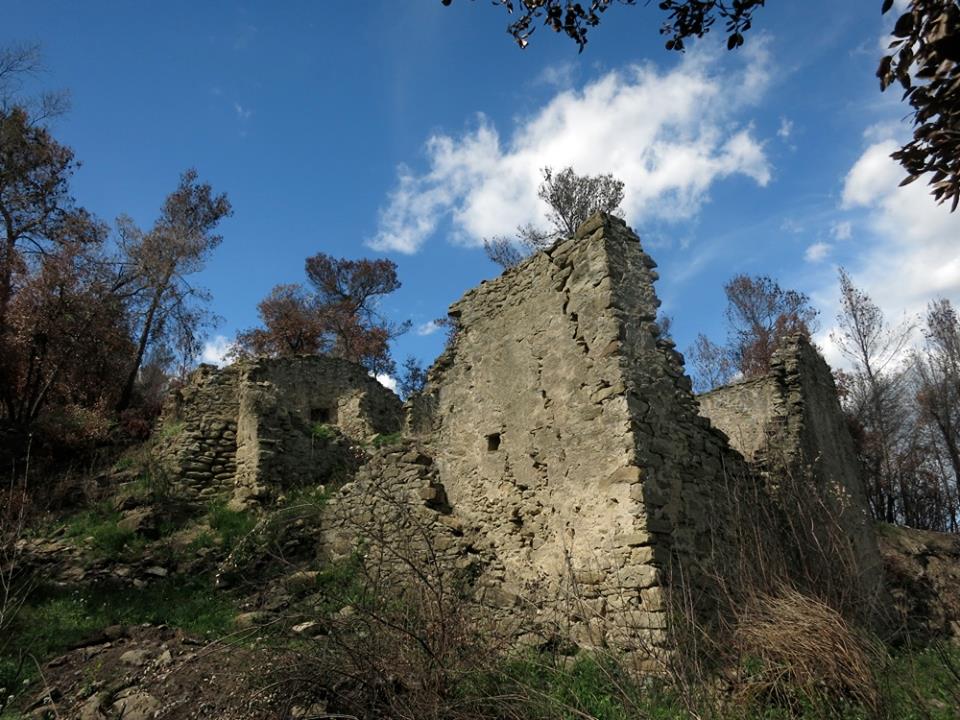 Travessat el riu per la resclosa de Colomers, vam resseguir avall direcció Foixà intentant localitzar l’ermita a la nostra dreta. No ho vam saber trobar. Però quan ja ho havíem deixat estar, allà lluny, gràcies a les clarianes en la vegetació que havia provocat l’incendi de l’estiu, vam veure el que semblava una construcció abandonada. Ens vam pensar que ja ho teníem. Vam pujar amb les bicicletes fins allà dalt i, per sorpresa nostre, vam veure que allò no eren les runes d’una ermita sino que eren les runes d’una construcció força ben conservada que semblava un habitatge.