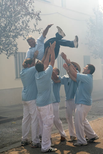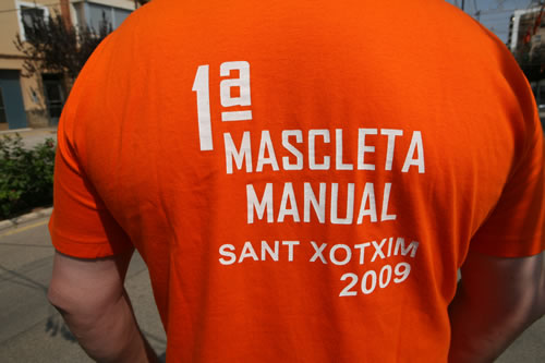 Consisteix en el llançament al terra de centenars de mascles (de categoria III i potencia 4) de forma manual per part d’unes deu persones, totes elles del barri, que posades de dos en dos, els van encenent amb l’ajuda d’una bengala. En P, que té ànima de coueter, hi va participar. Jo em vaig acontentar amb fer-ne fotografies i escoltar la brutal simfonia de trons. L’objectiu és crear una petita mascletà, amb un determinat ritme, prèvia a la mascletà gran, la que està penjada en cordes. La cosa va estar força bé i fins i tot la R, en veure que en algun moment el ritme baixava, no va poder estar-se d’aparèixer per allà a incrementar el ritme de llançaments. El conjunt de la mascletà manual i la de corda va ser brutal. I vista d’aprop, sense multituds, la cosa proporciona una experiència força potent. En B va acabar en braços dels festers, aclamat.