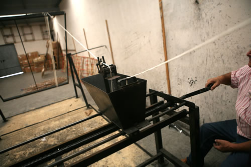 També ens va mostrar tot tipus de màquines velles, de ferro, amb què treballen. Vam veure una espècie de bidó de fusta, ple d’unes boles de bronze amb què es fa el polsim, combinació de nitrat de potassi i carbó, que després, barrejat amb el sofre, servirà per fer la pólvora explosiva. També ens va mostrar el giny que tenen per premsar bé la pólvora dins les carcasses. La joia de la fàbrica és una màquina, feta amb peces d’altres màquines, semblant a un teler, que el seu sogre va fer per tal de fabricar i emmagatzemar grans quantitats de metxa. Ens va explicar que hi ha molts tipus de metxes (sobre la base dels fils de cotó banyats amb pólvora) i com es pot fer per retardar la velocitat de cada metxa…