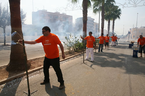L’endemà, diumenge al matí vam anar a Nules, a les festes d’un barri, on en B estava preparant una mascletà. L’altra cara de la moneda. Vam arribar mentre en B estava muntant la corrua de cordes que subjecten els mascles. Cap caixa xinesa a la vista i cap intenció, segons ell, d’utilitzar-les en aquest tipus d’ocasions. Una xiulada del públic pot suposar perdre prestigi. I en B i la resta de treballadors, en aquestes disparàs se la juguen. No poden ni volen fallar davant els seus. I per això miren de fer coses noves. Mentre esmorzàvem ens va demanar si volíem ajudar-lo a llançar els mascles de la I Mascletà Manual, un invent que s’havia empescat especialment per aquesta festa.