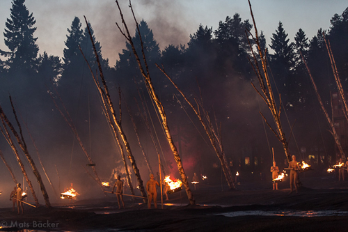 També hi introdueix les falles solsticials andorranes, balancejant-se enmig d’un tètric bosc de troncs inclinats. De nou, La Fura demostra que coneix bé la festa tradicional, doncs aquest bosc que recrea i del que en surten les falles està fet de bedolls, el mateix material amb què es construeixen tradicionalment aquestes boles de foc d’Andorra (escorça seca de bedoll).