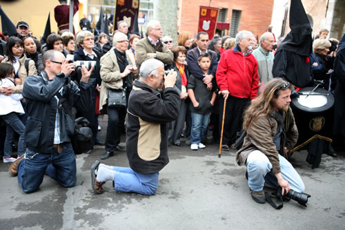 Fa temps que, anant amunt i avall per aquests móns de Déu, documentant festes populars, m’entretenc a observar també què fan els espectadors durant determinats actes. Molts d’ells no es miren realment el que passa davant seu sino que només fan fotografies, que és molt diferent. Alguns pocs semblen fotògrafs professionals o documentalistes. La gran majoria més aviat busquen l’obtenció d’un record personal o el joc amb la màquina, però en alguns d’ells em sembla veure-hi una nova forma de devoció. Per això els fotografio. Deixo algunes mostres d’aquesta perspectiva fetes durant les Festes de Misericòrdia de Reus, d’aquest any.