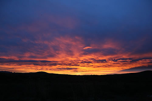 Vam dinar a Reus, amb la russa, i vam enfilar autopista avall, fins a Vinaròs. Una mica més avall, a l’alçada de Torreblanca, s’agafa una petita carretera secundària que mena fins a l’interior, a través d’un petit altiplà que cal enfilar. Arribats allà, la sorpresa va ser contemplar el cel que s’exhibia davant nostre. Aquell roig intens, graduat, semblava una premonició del que anava a passar unes hores més tard en aquell petit poble que es veia allà lluny. Abans de que succeís, el foc, la festa, ja ens l’explicaven els núvols.
