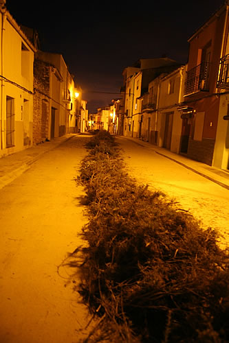 Malgrat que havia promès al M no explicar-li res sobre la dinàmica de la festa, quan va veure totes aquelles piles d’argelaga, vaig acabar xerrant més del compte. L’evidència és impossible d’ocultar. Aquesta gent dipositen a terra, distribuïdes pels carrers del poble, unes grans mates d’argelaga portada del bosc per a l’ocasió i després les hi peguen foc. Hi ha fileres d’argelaga en paral·lel al carrer i, només en alguns punts estratègics, hi ha una gran barrera d’argelaga disposada en horitzontal, de banda a banda. La festa funciona a base de l’oposició lúdica entre dos bàndols, molt diferents en número d’efectius: els que posen les argelagues i les apilonen (que són pocs, els majorals), i els que passen a través del foc amb els cavalls i la resta de públic (que es poden comptar per centenars). Aquesta oposició és l’eix de la festa. Uns apilonen l’argelaga i li foten foc i els altres esperen, amb els cavalls, a que les flames hagin disminuït una mica, per anar passant-hi a través.