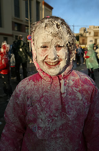 Gat escaldat, i pensant en el que jo faria si fós nen allà, he posat els sis sentits en marxa per estar a l’aguait dels més vius, dels més gamberros, dels que venen d’amagatotis i per sorpresa empastifen als més desprevinguts. I malgrat això, he quedat ben emmerengat. Però no m’he emprenyat ni gens ni mica. De fet, posar-se allà al mig i queixar-se seria absurd. Allà, en aquell context, els intrusos són els que, pel que sigui, no participen del joc. I no valen arguments com que “estem treballant”, com he pogut sentir d’una càmara de televisió de Tele 5 que malgrat estar alertada i malgrat disposar d’un protector proporcionat per la Federació d’Entitats dels Carnaval, no s’ha pres massa bé que li empastifessin completament la cara. Si et poses allà al mig, se suposa que saps els que et fas o almenys ho hauries de saber…