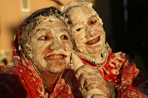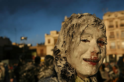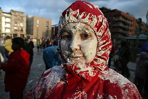 Avui, Dijous Gras, ha començat el temps del Carnaval oficial. Carregat amb equipació quasi d’esquí, amb un fred que pelava, me n’he anat a fotografiar la Merengada de Vilanova. Hi vaig ser fa uns anys amb la L i ja no me’n recordava que per a realitzar un bon treball en aquest acte cal dur, a més a més, algun tipus de plàstic protector, si un no vol acabar amb la roba completament empastifada de merenga.