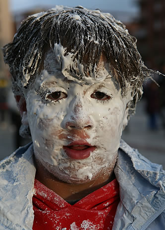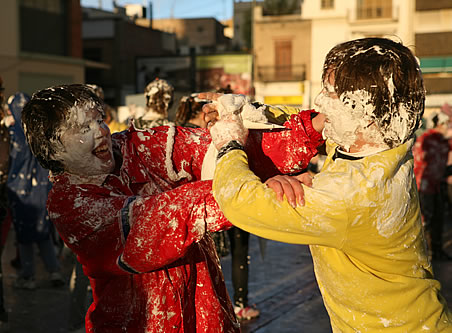 Així que, com que em falla la memòria, quan he arribat a casa semblava tornat de pintar les parets blanques d’un pis. Pantalons, jaqueta i bambes estaven força emmerdades, tot i que no m’ha costat ni cinc minuts netejar-ho tot amb una mica d’aigua calenta. He arribat a Vilanova just minuts abans que el pastisser Blanch traiés la gran merenga pel balcó del seu establiment i comencés la gran empastifada col·lectiva. En aquest joc festiu hi participen sobretot nens i nenes en edat escolar i, precisament per això, és tant lluït. Els nanus tenen ganes de gresca i durant una bona estona els carrers, i especialment la plaça de davant el Mercat públic, es converteixen en l’escenari on milers de cares blanques amb grans somriures juguen a empastifar-se.