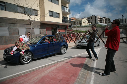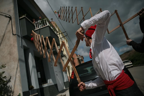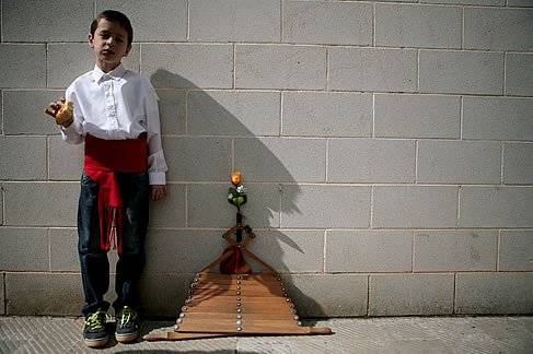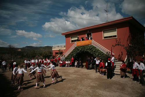 Durant una estona, a mig matí, acompanyo dos dels ballesters, parlant amb ells mentre anem d’una casa a l’altra. M’expliquen que les seves dones no venen mai aquest dia i no m’estranya. Els jocs i les bromes dels ballesters amb les noies que hi ha per allà, amb les que són als balcons però també amb les que hi ha pels carrers, són constants. Formen part del ritual caramellaire. A mig matí, per exemple, abans d’arribar a la plaça de l’església, caminem davant un grup de noies que atrau la nostra atenció. Una d’elles marca, texans endins, un cul preciós del que en comencem a cantar, en veu alta, les excel·lències. Els ulls se’ns hi aboquen. Esmorzar de forquilla i ganivet! Jo, que em poso dins el joc, els incito a fer anar la ballesta fins allà, però no s’hi atreveixen perquè la noia no és del poble. Hi ha doncs, un límit a la conya, que posen ells mateixos. Quan les noies giren a la dreta i nosaltres continuem avall, una d’elles, descollonant-se de riure dels nostres comentaris mentre fa que no amb el cap, ens anomena “primitius”. Més tard, una amiga d’un dels ballesters arriba amb cotxe i aleshores si, li fan arribar la ballesta fins la finestra, amb una flor que ella accepta gustosa, mentre em demanen que ho fotografii.