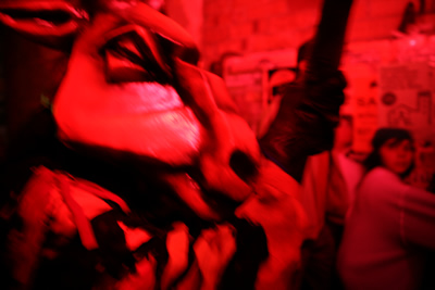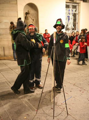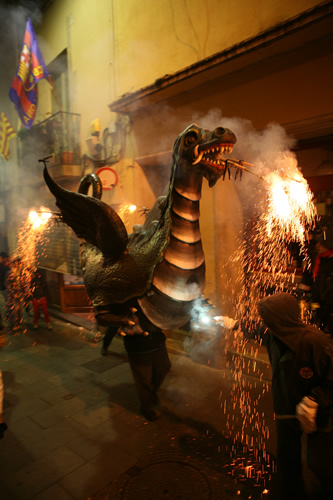Fora, al carrer, el drac es posa en marxa. Ho anuncien els seus portadors llançant tres voladors. Durant el trajecte em trobo un fotògraf que vaig conèixer a Òrrius durant la festa del poll i em diu que encara m’ha d’enviar les fotos del xop ple d’ofrenes (electrodomèstics, testos, bicicletes i altres objectes manllevats per les cases dels veïns). Ja no m’en recordava. Diu que un dia va sentir que parlaven de festes.org per la ràdio (?) i hi va pensar. Forma part dels Equips de Suport, una espècie de força d’ordre popular que acompanya certes festes mataronines. Que jo sàpiga és un grup únic, que s’han inventat a Mataró, sorgit de gent que ve dels bombers i la creu roja local, que per les festes s’autoorganitzen per garantir la seguretat i el correcte desenvolupament, sobretot de correfocs i altres actes festius. Coneixen la festa i hi treballen des de dins. Utilitzen uns vestits propis, molt semblants als que duen els participants dels actes amb foc, i un sistema de comunicacions intern que els fa estar permanentment conectats entre ells per si hi ha alguna incidència. Són una bona alternativa a les forces de seguretat oficials que, desconeixedors de l’ambient i el tarannà de les festes, sovint s’excedeixen de les seves atribucions i donen a la festa popular un aire que no ha de tenir mai.