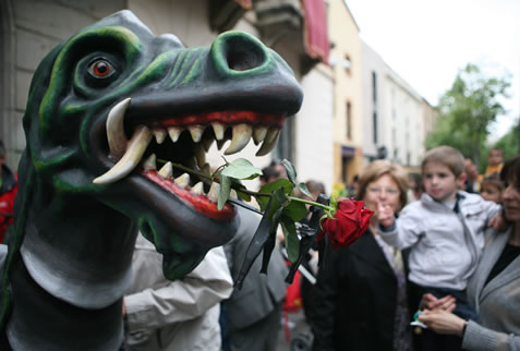 Uns nens que duen mitja cara tapada amb un mocador, un barret al cap i unes ulleres de plàstic, increpen al boc -un personatge sinistre que substitueix al drac durant l’obra- perquè deixi anar la princesa que ha raptat. A Mataró fan una recreació de la llegenda de sant Jordi i el drac força interessant per la manera com es posa en escena: es fa en moviment, pels carrers i places. Hi participen el drac, els foguers, el boc, la princesa, un sant Jordi a cavall i un relator-narrador que va explicant la llegenda mentre aquesta es posa, al mateix temps, en escena. Es teatre de carrer pur i dur, mediterrani, fresc, que em recorda al que feien els Comediants al principi. Tota la gent que hi participa són amateurs, la gent del poble que duu els entremesos festius i tothom qui s’hi vol sumar. Tot és molt espontani i espectadors i actors es fusionen creant un ambient de festa i joc molt interessant. Això si, hi ha un guió i cal seguir-lo. I això és molt important: tota la cercavila, tot el recorregut, és una posada en escena d’un relat: el de la llegenda del drac. El Drac de Mataró és una peça de bestiari molt guapa, rèplica del que el gegant Robafaves duu al casc. En aquest sentit, s’assembla al gegant Guifré de Matadepera, amb l’única diferència que a Matadepera encara no hi ha drac festiu. Tot això em fa pensar, una altra vegada, si sant Jordi ha estat col·locat per l’Església cristiana -i el poble- per substituir personatges mítics locals – en Guifré, en Robafaves- molt més antics (en culte i devoció) i arrelats que el sant cristià. No ho sé, però podria ser. O passa això o bé considerem en Robafaves, com Guifré, els representants locals d’un arquetip universal, un heroi matador de dracs, encarnat en la figura de Sant Jordi.