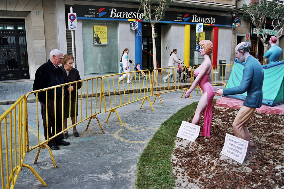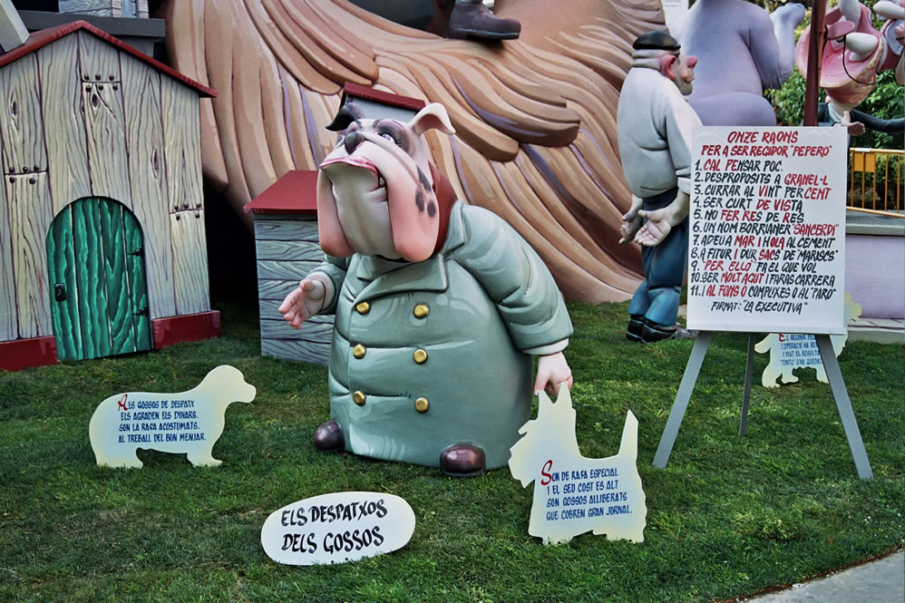 Així, molts monuments s’han buidat de sentit. Per això, quan hom baixa a falles, pot veure que cremen ninots tipus Walt Disney (per cert, fent això, el que aconsegueixen és produïr un dany a aquests dibuixos animats). Aquest no entendre el propòsit del que s’està fent, també és problema d’una part de l’esquerra, que volguent accentuar el sentit crític, crema, per exemple, un monument amb el quadre cap per avall de Felip V. Cremant una cosa així s’aconsegueix l’efecte contrari al que es desitja! En aquest cas concret, si el que es vol denunciar la Desfeta d’Almansa -posem per cas-, el que cal fer és posar Felip V de peu i no al revés, i pegar-li foc.